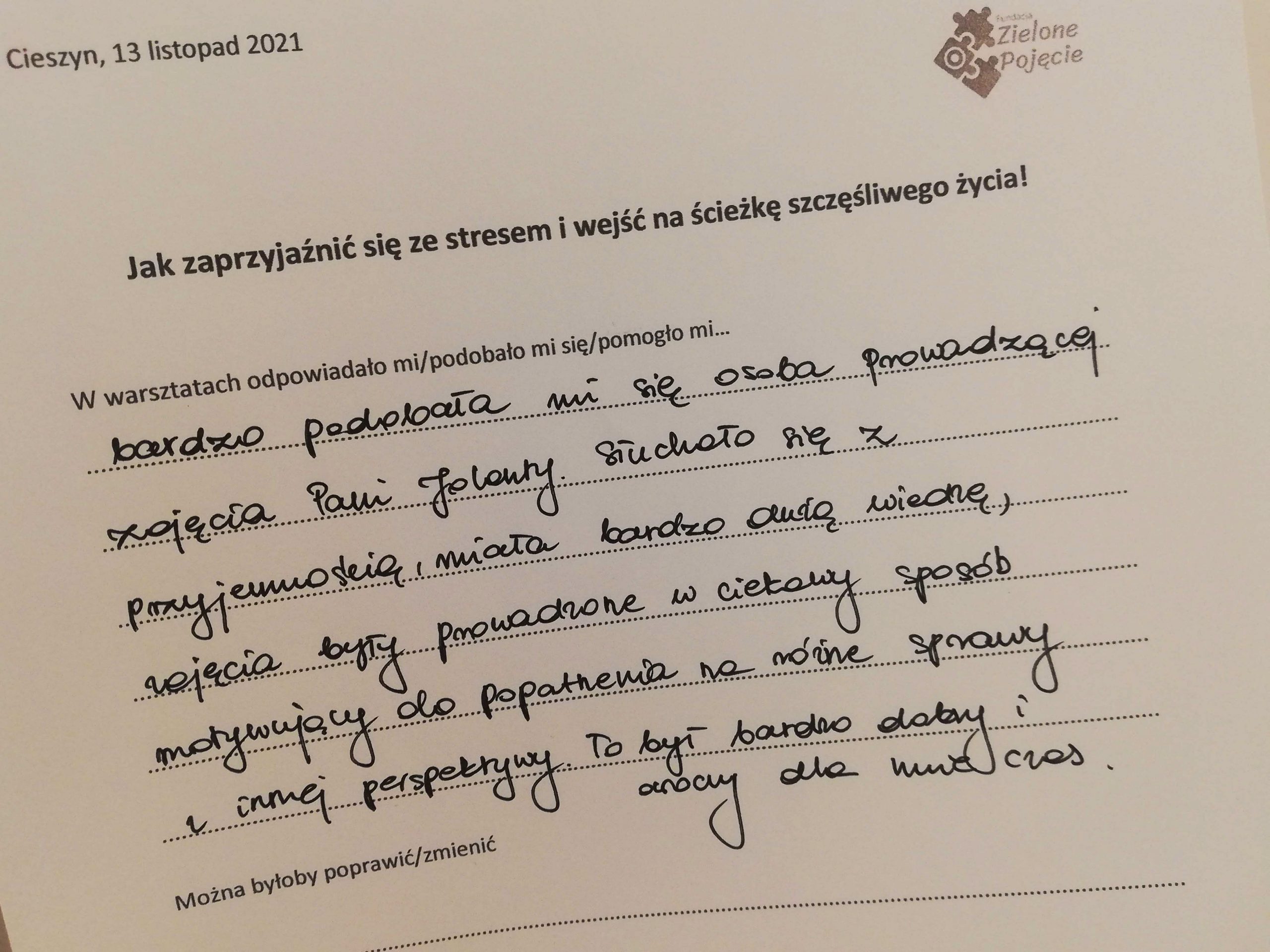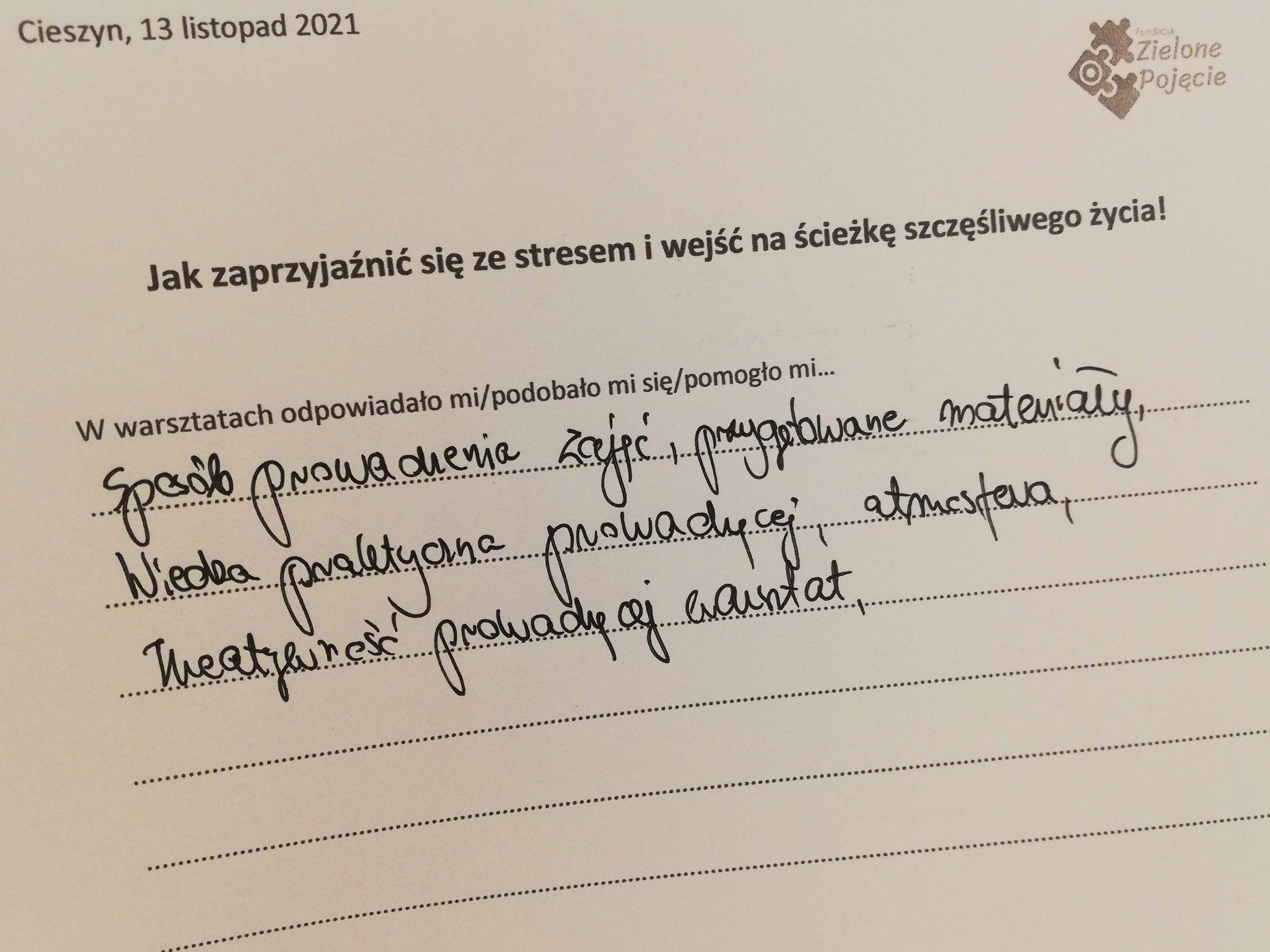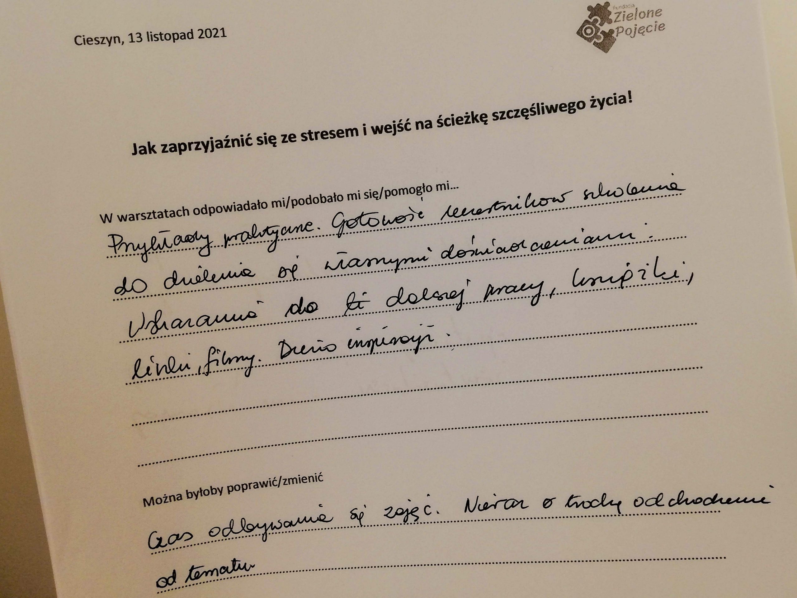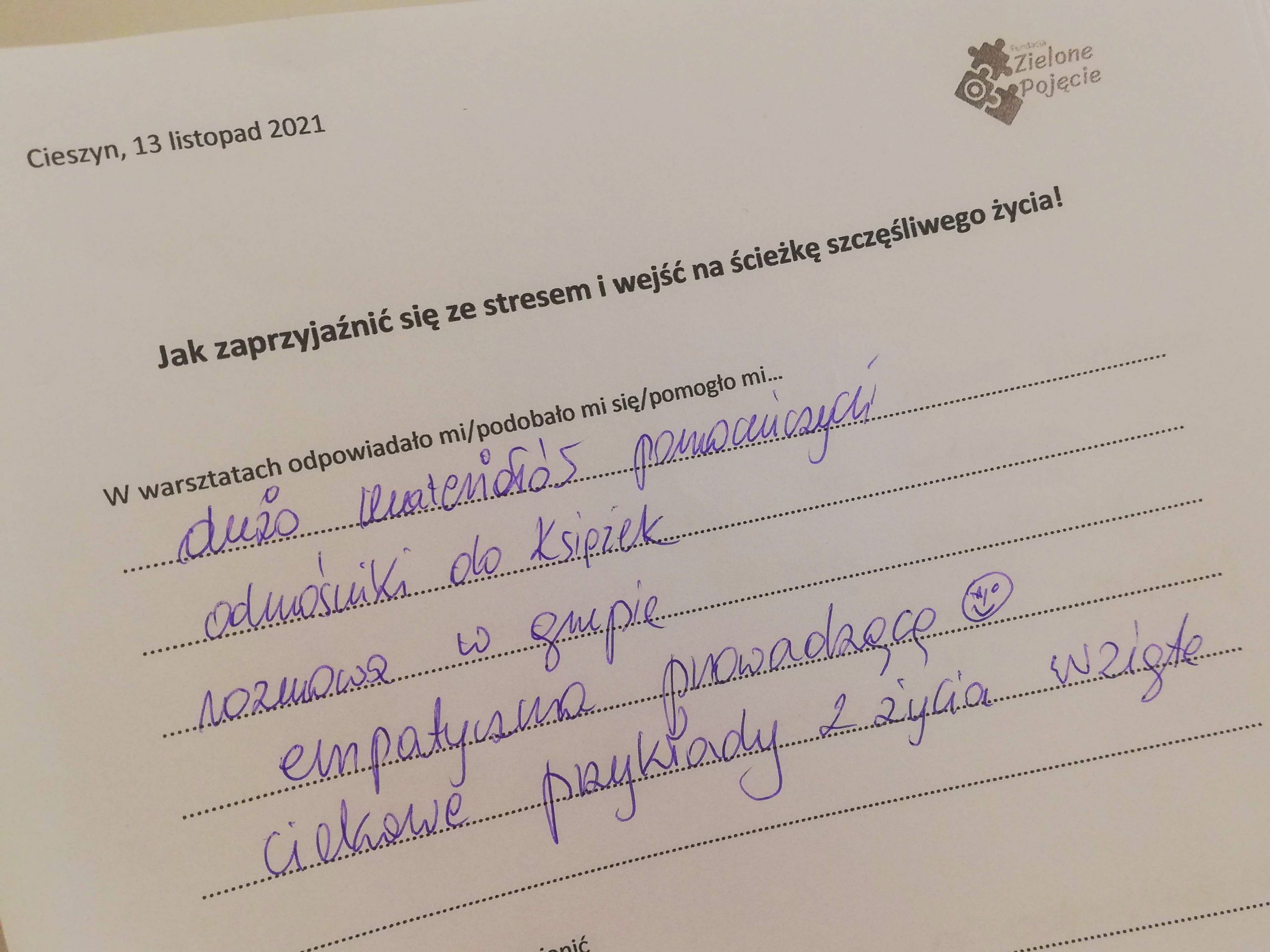 Jak zaprzyjaźnić się ze stresem i wejść na ściekę szczęśliwego życia, tak zatytułowany jest projekt (konkurs „Mikrodotacje na realizację lokalnych inicjatyw” realizowany w ramach „Śląskie NOWEFIO na lata 2021-2023”), w ramach którego zapraszaliśmy na warsztaty przez cztery soboty, na przełomie października i listopada, w Cieszynie. Tak, soboty! Dla wielu dzień wolny od pracy. W mojej tradycyjnej rodzinie sobotę od rana poświęcało się na dokładne sprzątanie. Pewnie w wielu domach tak jest do dziś. Odkurzacz, mop, mokra ściera do kurzów. Tak, porządek w naszym najbliższym otoczeniu jest bardzo ważny. Zaproponowałam coś innego, próbę uporządkowania tego, co nas gniecie w środku.