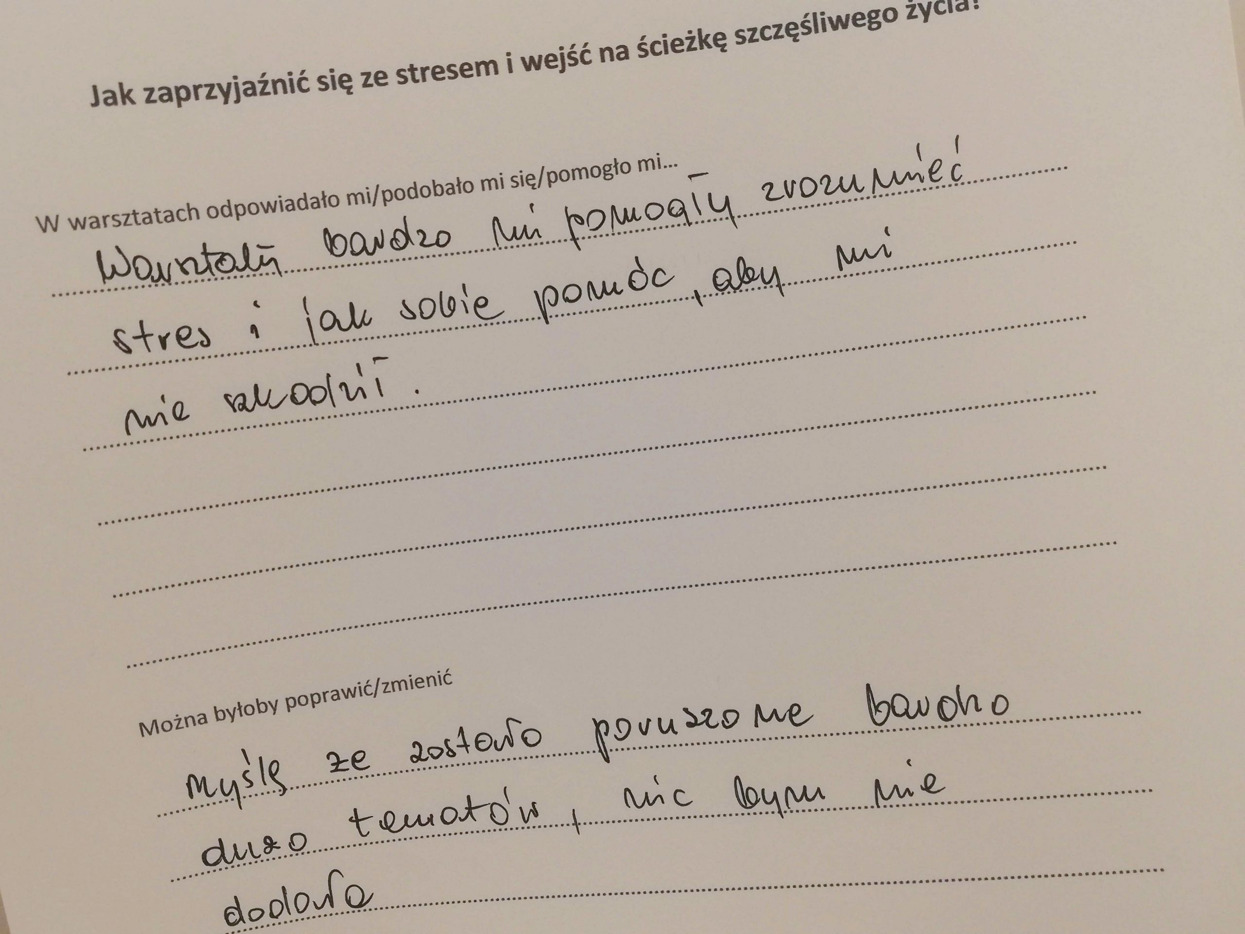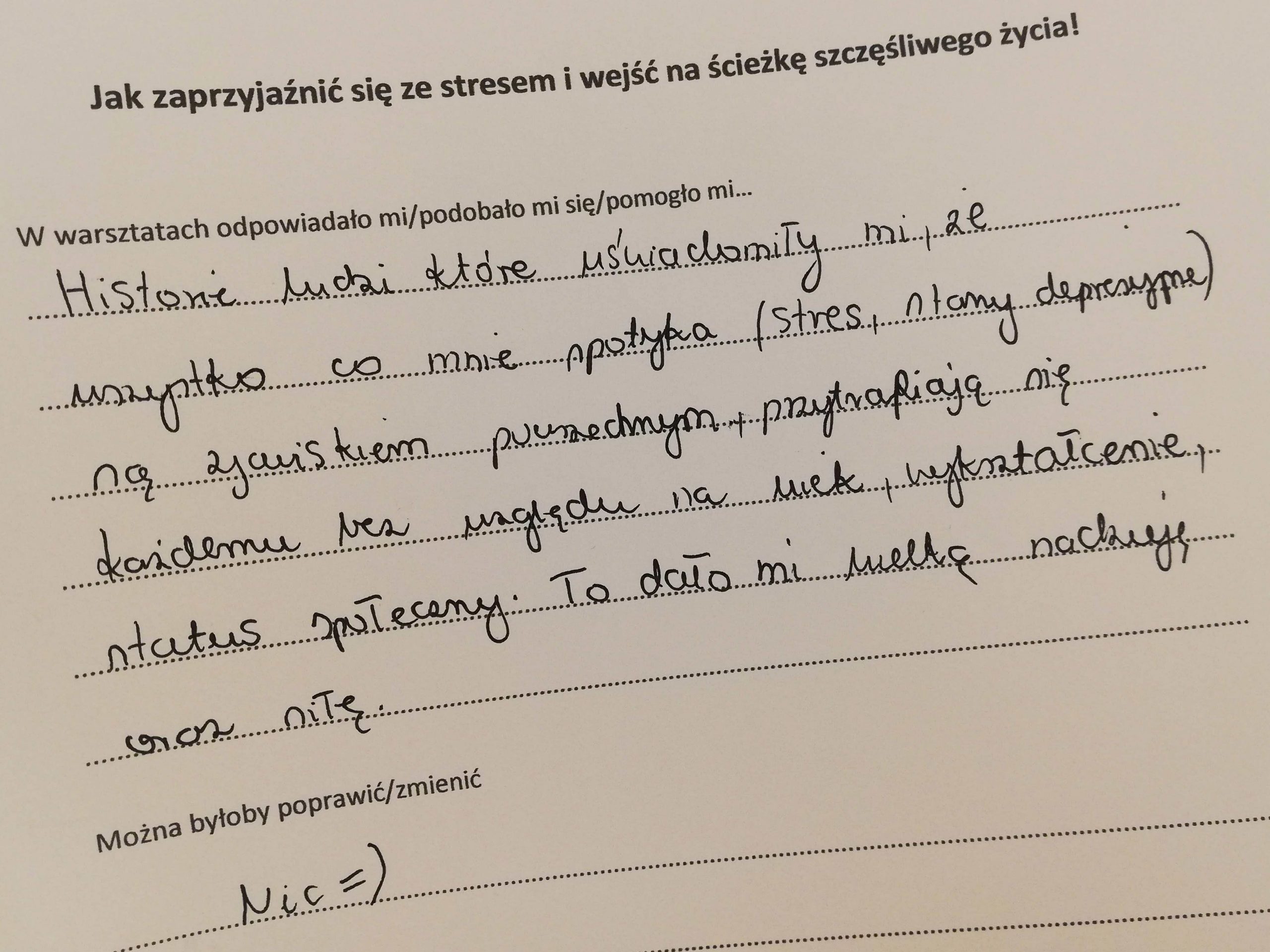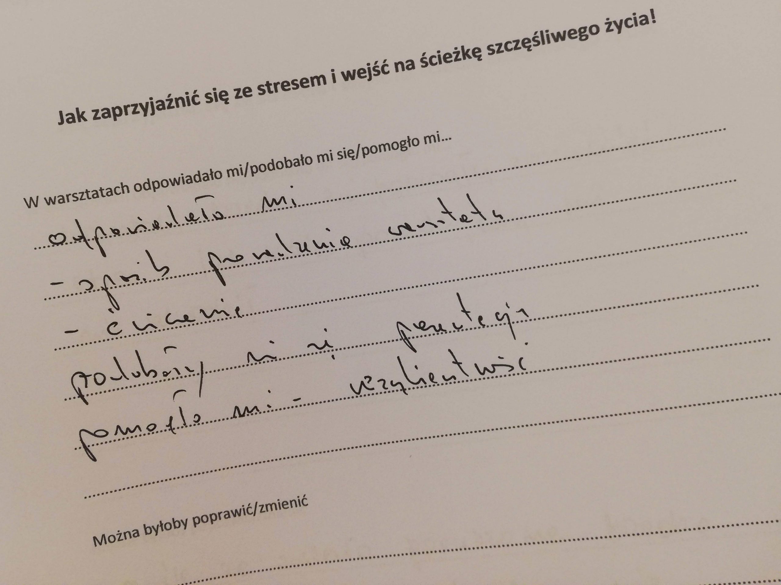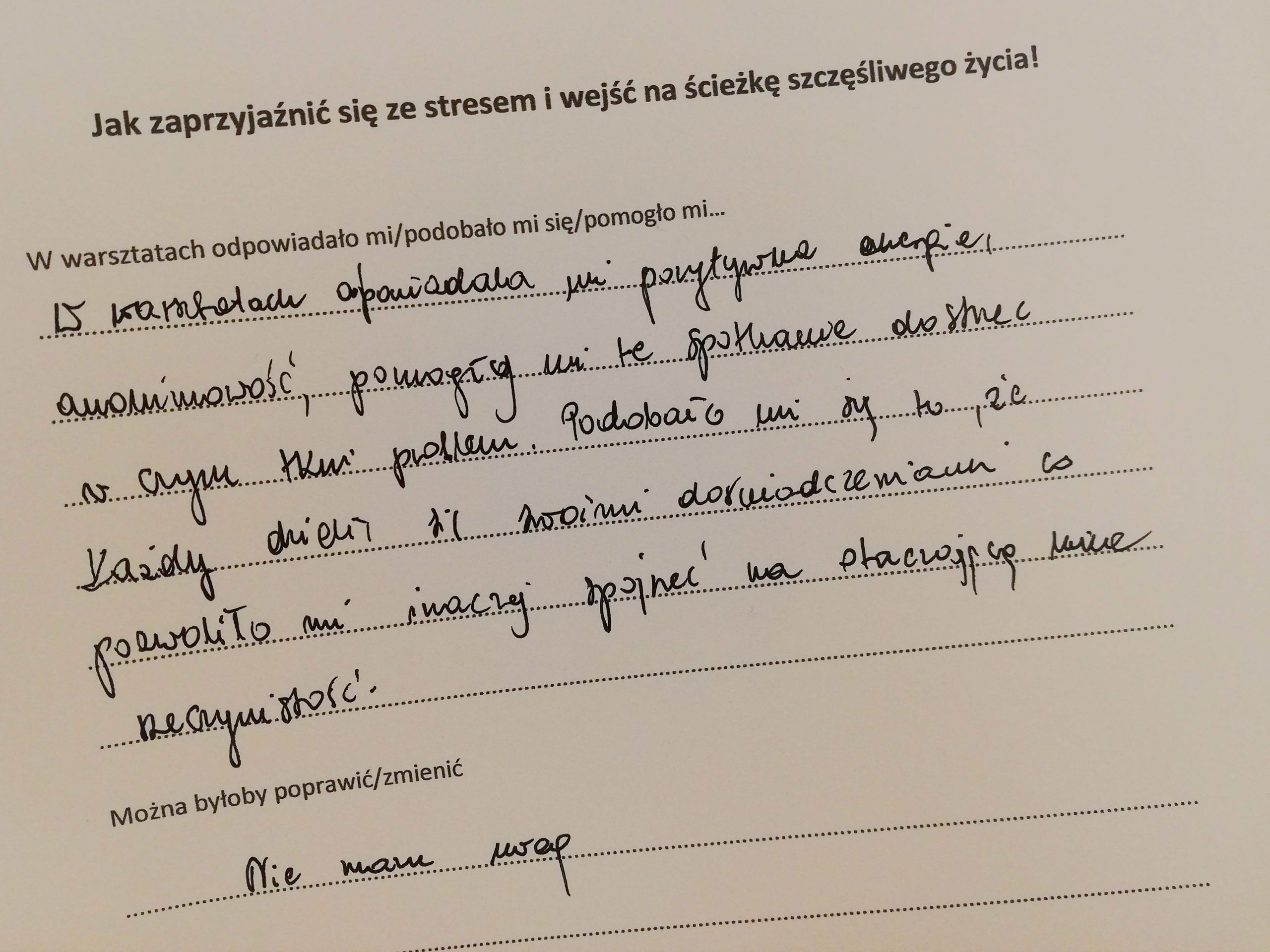 Jak zaprzyjaźnić się ze stresem i wejść na ściekę szczęśliwego życia, tak zatytułowany jest projekt (konkurs „Mikrodotacje na realizację lokalnych inicjatyw” realizowany w ramach „Śląskie NOWEFIO na lata 2021-2023”), w ramach którego zapraszaliśmy na warsztaty przez cztery soboty, na przełomie października i listopada, w Cieszynie. Tak, soboty! Dla wielu dzień wolny od pracy. W mojej tradycyjnej rodzinie sobotę od rana poświęcało się na dokładne sprzątanie. Pewnie w wielu domach tak jest do dziś. Odkurzacz, mop, mokra ściera do kurzów. Tak, porządek w naszym najbliższym otoczeniu jest bardzo ważny. Zaproponowałam coś innego, próbę uporządkowania tego, co nas gniecie w środku.